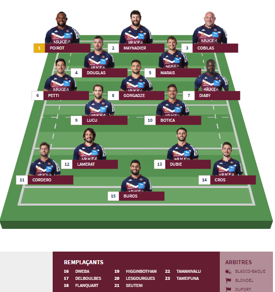 "ბორდოს" ძირითად შემადგენლობაში მიმდინარე სეზონში პირველად ითამაშებს ბექა გორგაძე, რომელიც რვა ნომრის პოზიციაზეა გამწესებული. ბექამ წლევანდელ ტოპ 14-ში პირველად 5 ოქტომბერს "ლიონის" წინააღმდეგ შეცვლაზე 33 წუთის განმავლობაში ითამაშა. ლექსო ყაულაშვილს მცირე ტრავმა აწუხებს და ვერ ითამაშებს, განაცხადში არაა არც ლაშა ტაბიძე.