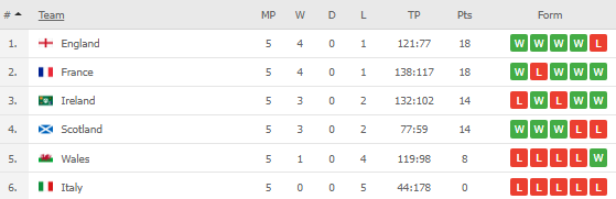 ინგლისმა ბოლო ტურში "სტადიო ოლიმპიკოზე" იტალიას 34:5 აჯობა და პირველ ადგილზე გადაინაცვლა, დასკვნით მატჩში კი საფრანგეთმა ირლანდია ბონუსით 35:27 დაამარცხა და ორივე ნაკრებმა 18-18 ქულა დააგროვა, მაგრამ იქიდან გამომდინარე, რომ გატანილ-გაშვებულ ქულებში ინგლისს +44 აქვს შეფარდება, ხოლო საფრანგეთს +21, ჩემპიონი სწორედ ედი ჯონსის გუნდი გახდა.