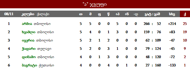 შესანიშნავ სერიას განაგრძობს თბილისის "არმია", რომელიც დიდ 10-ში დაბრუნების მთავარი კანდიდატია. მათ შევარდენის ბაზაზე ამჯერად "დინამო" დაამარცხეს ბონუსით 55:7. შესაბამისად, "არმიას" ხუთიდან ხუთი მოგება აქვს და გათამაშებას 25 ქულით ლიდერობს.
