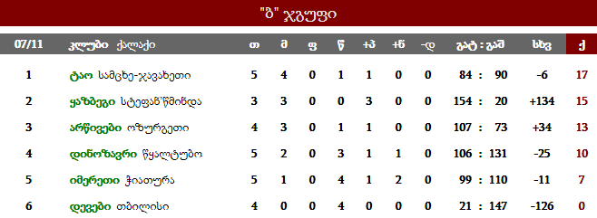 ოზურგეთის "არწივები" საკუთარ მოედანზე წყალტუბოს "დინოზავრებს" დაუხვდა და 36:17 აჯობა, ხოლო ჭიათურის "იმერეთმა" ავჭალაში "დევები" 41:10 დაამარცხა და ბონუსი აიღო.