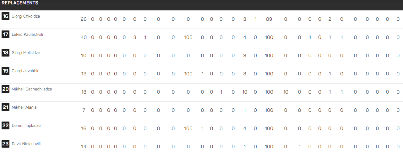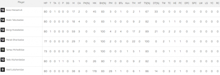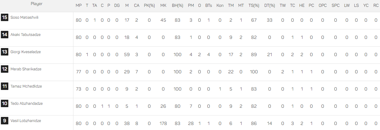 ტერმინების განმარტება: MP - ნათამაშები წუთი, T - ლელო, TA - სალელოვე გადაცემა, C - გარდასახვა, P - გატანილი ჯარიმა, DG - არეკნი, M - გავლილი მეტრები, CA - წაღებული ბურთი, PK (%) - ბურთის მოშორება, MK - დარტყმული მეტრები, BH (%) - ხელით ნათამაშები ბურთი, PM - პასები, O - ოფლოუდები, BTS - მბოჭავზე გასხლტომა , Kon - წინ თამაში, TM - გაკეთებული ბოჭვები, MT - გაფუჭებული ბოჭვები, TS (%) - წარმატებული ბოჭვები (%), DT (%) - დომინანტი ბოჭვები (%), TW - ღლეტვა, TC - ბურთის დაკარგვა, HE - ხელით თამაშისას შეცდომა, PC - აკიდებული ჯარიმა, OPC - თამაშგარის გამო მიღებული ჯარიმა, SPC - შერკინებაში ჯარიმა, LW - მოგებული დერეფანი, LS - დერეფნის ჩაჭრა, YC - ყვითელი ბარათი, RC - წითელი ბარათი.