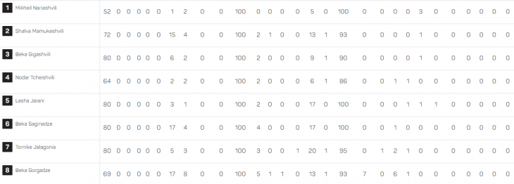 კვესელაძემ ულამაზესი ლელოს გატანის გარდა, 3-ჯერ წაიღო ბურთი და 59 მეტრი გაიარა და 17 ზუსტი ბოჭვა შეასრულა. შარიქაძე 22 ზუსტი ბოჭვით გამოირჩა, რაც ორივე გუნდის რიგებში საუკეთესო მაჩვენებელია. გარდა ამისა, კაპიტანმა 7-ჯერ შეუტია, 29 მეტრი მოიგო და 2 ღლეტვა განახორციელა. თორნიკე ჯალაღონიამ, რომელმაც დღეს პირველად ითამაშა სასტარტოში, 20 ზუსტი ბოჭვა შეასრულა და 2-ჯერ შედეგიანად ჩავიდა ბურთზე.