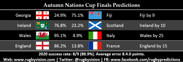 სარაგბო პროგნოზების საიტმა rugbyvision.com-მა აღნიშნული შეხვედრებისთვის თავისი პროგნოზები გამოაქვეყნა. როგორც იცით, მე-7 ადგილისთვის შეხვედრაში საქართველოს ნაკრები ფიჯის უნდა და დაუპირისპირდეს, საიტის მიხედვით ფიჯის ნაკრები 75.1%-ით მატჩის ფავორიტია და მათ 9 ქულიან ფორას ანიჭებს. ბორჯღალოსნების შანსები კი 24.9%-ით არის შეფასებული.