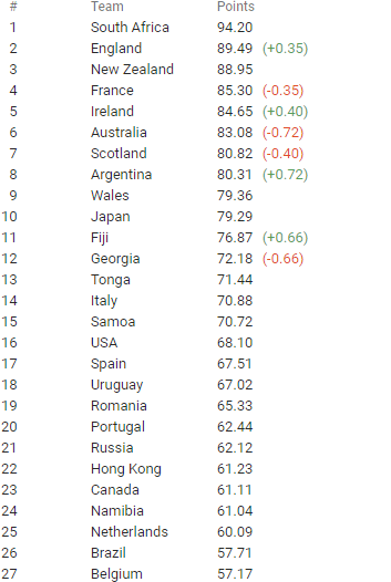 ბოლო მატჩების მიხედვით, სარეიტინგო ქულები მოიხვეჭეს ინგლისმა (0.35), ირლანდიამ (0.40), არგენტინამ (0.72) და ფიჯიმ (0.66), ხოლო ქულები მოაკლდათ საფრანგეთს (0.35), შოტლანდიას (0.40), ავსტრალიას (0.72) და საქართველოს (0.66). "ბორჯღალოსნებმა" 2020 წელი 72.18 ქულით მე-12 ადგილზე დაასრულეს.