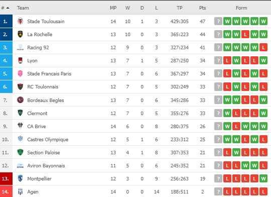 "ტულუზმა" 47 ქულა დააგროვა და ტოპ 14-ს სათავეში ჩაუდგა, თუმცა ამ ტურში "ლა როშელის" მატჩი გადაიდო, რომელსაც 43 ქულა დარჩა და ამ მატჩის მოგების შემთხვევაში, კვლავ გალიდერდება.