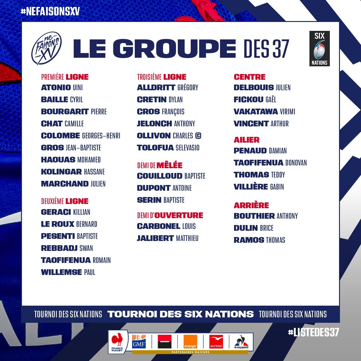 ლაპორტის სიტყვები კი სულ მალე საფრანგეთის რაგბის კავშირის ოფიციალურმა ვებგვერდმა გაამყარა, რომელმაც 2021 წლის 6 ერის პირველი ტურის მატჩისთვის, საფრანგეთის ნაკრების გაფართოებული 37-კაციანი შემადგენლობა გამოაქვეყნა. "ლე ბლე" შეკრებას 24 იანვრიდან დაიწყებს, ხოლო პირველ შეხვედრას 6 თებერვალს გასვლაზე იტალიის წინააღმდეგ გამართავს.![]()