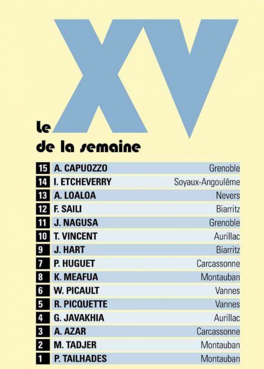 ცნობილმა ფრანგულმა სარაგბო გამოცემა "მიდი-ოლიმპიკმა" პრო დ2-ის მეთვრამეტე ტურის სიმბოლური გუნდი გამოაქვეყნა.
