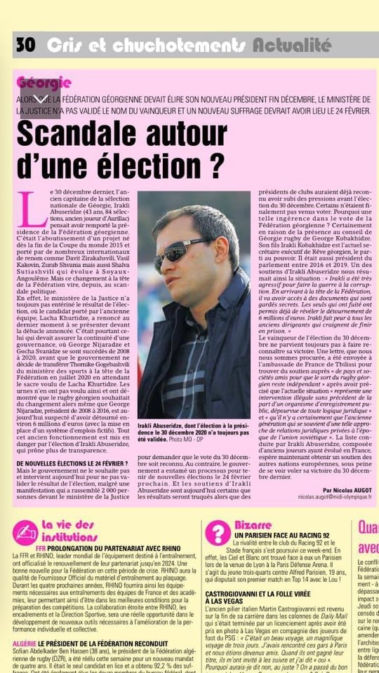 საქართველოს რაგბის კავშირის არჩევნებთან დაკავშირებულ პროცესებს, ცნობილი ფრანგული სარაგბო გამოცემა "მიდი-ოლიმპიკი" გამოეხმაურა.