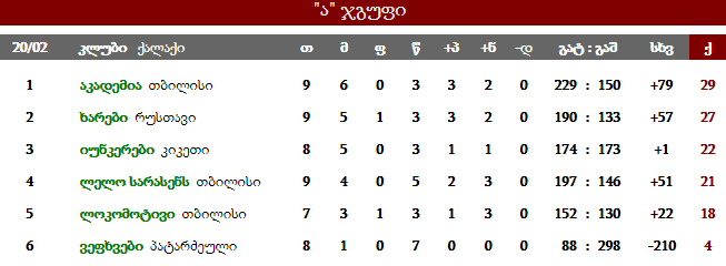 "აკადემია" ზედიზედ მეორედ დამარცხდა, თუმცა 29 ქულით კვლავ "ა" ჯგუფის ლიდერია და პლეი-ოფში თამაში თითქმის გაინაღდა, რადგან "ლელო სარასენსი" მას ქულებით ვერ დაეწევა, ხოლო "იუნკერები" და "ლოკომოტივი" გადადებულ მატჩში ერთმანეთს ეთამაშებიან.