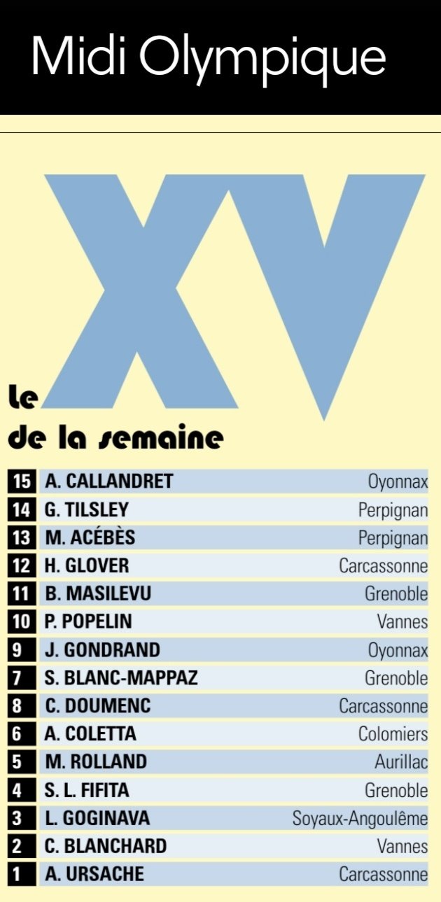 ცნობილმა სარაგბო გამოცემა "მიდი-ოლიმპიკმა" პრო დ2-ის 23-ე ტურის სიმბოლური გუნდი გამოაქვეყნა, რომელშიც "ანგულემის" ბურჯი ლუკა გოგინავა მოხვდა.
