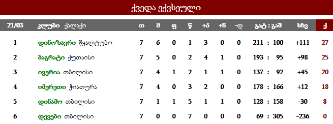 ცენტრალური შეხვედრა "აია არენაზე" გაიმართა, სადაც წყალტუბოს "დინოზავრმა" უშუალო კონკურენტი "ბაგრატი" დაძაბულ ბრძოლაში 13:3 დაამარცხა და პირველ ლიგაში გალიდერდა. წყალტუბოელებმა ქუთაისელებს ორი ქულით გადაუსწრეს.