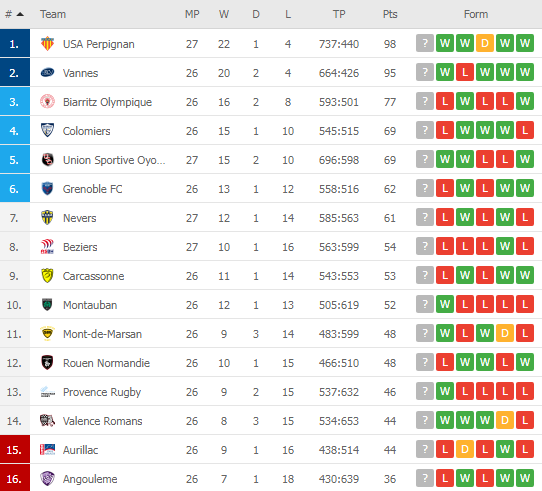 "პერპინიანისთვის" გასარკვევი მხოლოდ ის გახლავთ, პირველ ადგილს დაიკავებს თუ მეორეს. "ვანს" 95 ქულა აქვს, დღეს შინ "რუანს" ეთამაშება და დიდი ალბათობით, ნახევარფინალის საგზურს ისინიც გაიფორმებენ. როგორც იცით, პირველ და მეორე ადგილოსანი გუნდები პრო დ2-ის პლეი-ოფის პირველ ანუ მეოთხეფინალურ ეტაპს გამოტოვებენ და პირდაპირ ნახევარფინალში ჩაერთვებიან. გასარკვევი მხოლოდ ის იქნება, თუ ადგილის მიხედვით რომელ გუნდებს შეერკინებიან მეოთხედფინალიდან.