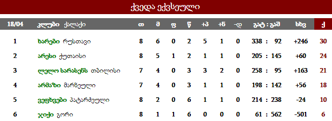 დიდი 10-ის მეორე ეტაპის ქვედა ექვსეულის მეოთხე ტურში რუსთავი "ხარები" გორის "ჯიქს" დაუხვდა და 64:0 დაამარცხა.