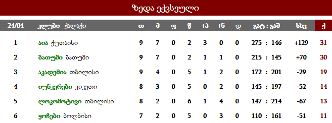 "ბათუმმა" 30 ქულა დააგროვა და ლიდერ "აიას" ქულით ჩამორჩება. ბოლო ტურში "ბათუმი" შინ "ლოკომოტივს" ეთამაშება, ხოლო "აია" საკუთარ მოედანზე "იუნკერებს" მიიღებს.