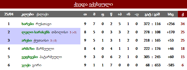 "ლელო სარასენსმა" 25 ქულა დააგროვა, "არესს" ქულებით გაუთანაბრდა და მეორე ადგილზე დადებითი ურთიერშეხვედრების ბალანსის ხარჯზე გადაინაცვლა. ამრიგად, მათ "არმაზს" 7 ქულით გაუსწრეს და დიდ 10-ში დარჩენა გაინაღდეს, რადგან ბოლო ტურში დაშლის პირას მყოფ "ჯიქს" ეთამაშება. მესამე ადგილზე კი დიდი ალბათობით "არესი" გავა და ორმატჩიან პლეი-აუტში "არმიას" შეერკინება.