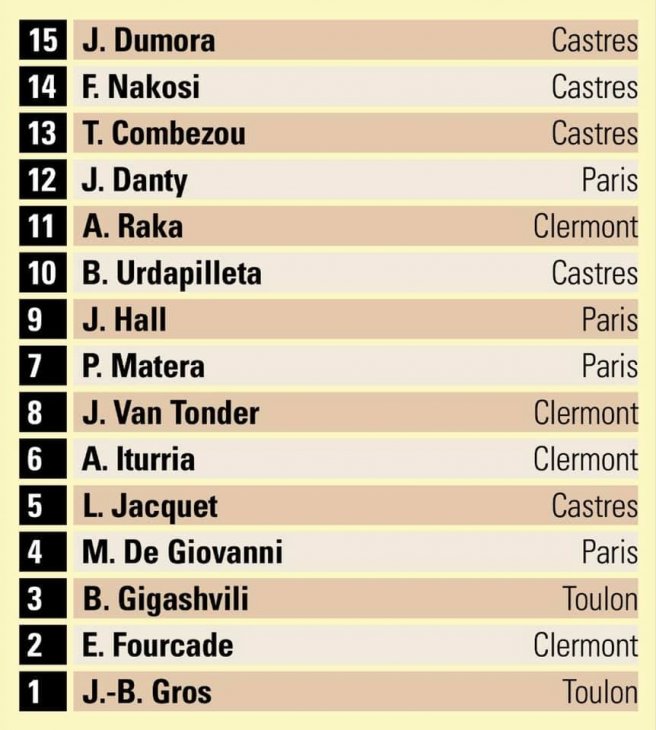 გასულ კვირას ტოპ 14-ში ოთხი გამოტოვებული შეხვედრა გაიმართა. "ტულონმა" "სტად მაიოლზე" ბოლო ადგილოსანი "აჟენი" ბონუსით 34:17 დაამარცხა. ტულონელთა ძირითად შემადგენლობაში გახლდათ მარჯვენა ბურჯი ბექა გიგაშვილი, რომელმაც მინდორზე 61 წუთი გაატარა და მორიგი დასამახსოვრებელი მატჩი შემოგვთავაზა. "ბორჯღალოსნების" პირველხაზელის კარგი თამაში კი ზემოხსენებულ გამოცემას შეუმჩნევლად არ დარჩენია და კვირის საუკეთესო თხუთმეტეულში შეიყვანა.