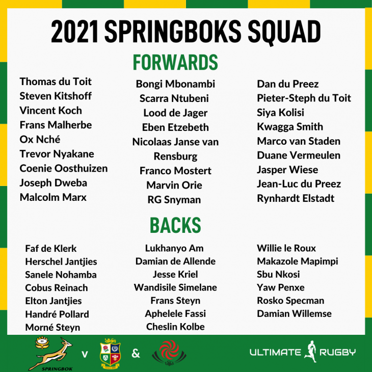 "სპრინგბოკსი" 2019 წლის მსოფლიო თასის შემდეგ პირველად იასპარეზებს და ბუნებრივია, რომ მათმა ახალმა მთავარმა მწვრთნელმა უძლიერეს შემადგენლობას უხმო, რომლის რიგებშიც 29 მსოფლიო ჩემპიონი და 8 დებიუტანტია. უკეპო მორაგბეები არიან: უკანახაზელები - აფელელე ფასი, ფრთა იოვ პენქსი, როსკო სპეკმანი, ვანდისილე სიმელანი, სანელე მოჰამბა და მორკინალები - იასპერ ვიზე, ნიკო იენს ვან რენსბურგი და ჯოზეფ დვება.