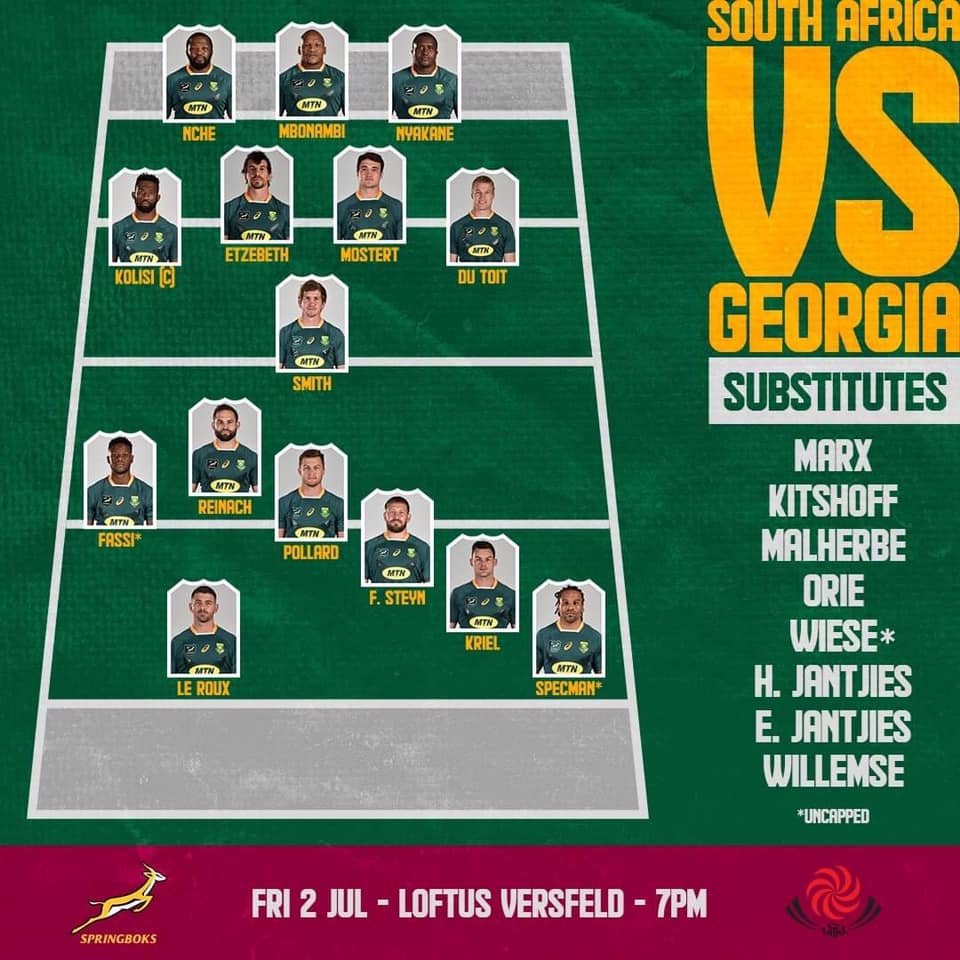 "სპრინგბოკსის" სასტარტო თხუთმეტეულში ორი უკეპო მოთამაშეა და ორივე ფრთაა - როსკო სპეკმანი და აფელელე ფასი, ხოლო კიდევ ერთი დებიუტანტი მესამეხაზელი იასპერ ვიზე მარქაფაშია. სამხრეთ აფრიკის ნაკრების მთავარი მწვრთნელის პოსტზე დებიუტი ექნება ჟაკ ნინაბერსაც. სხვადასხვა მიზეზების გამო, მსოფლიო ჩემპიონებს მოახლოებულ მატჩში ჩესლინ კოლბი, რაინარდ ელსტადტი, ფაფ დე კლერკი, არხი სნეიმანი, დუეინ ვერმულენი, ვინსენტ კოხი, სბუ ნკოსი და დამიან დე ალენდე არ ეყოლებათ.