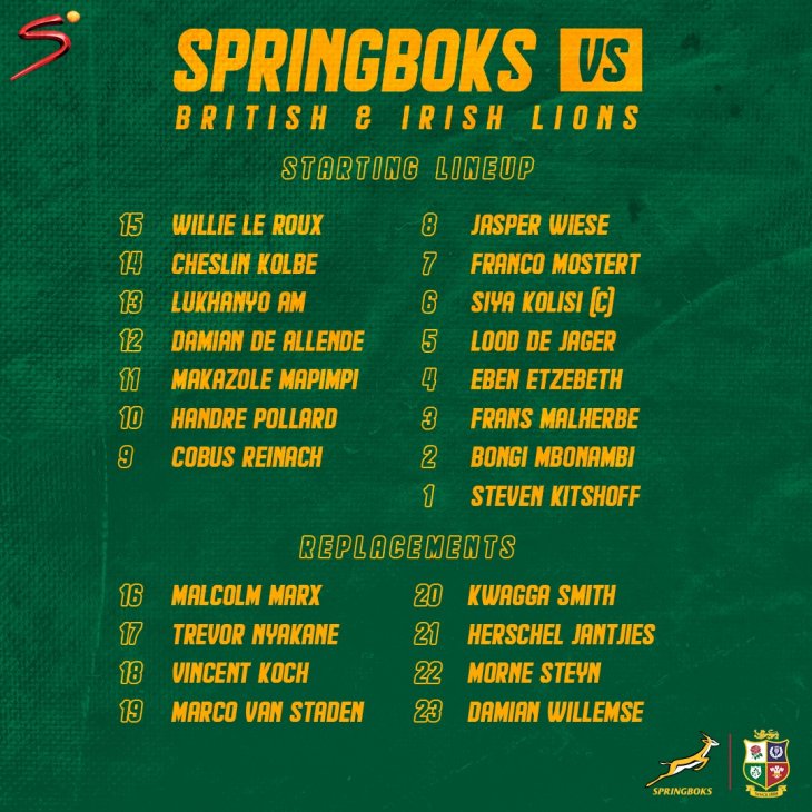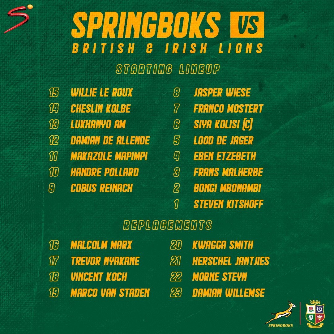 როგორც ჩანს, 100%-ით გამომჯობინება ვერ მოასწრო დუეინ ვერმულენმა, რომელიც "სპრინგბოკსს" კვირას შეუერთდა, თუმცა საბოლოო ჯამში "ლომებთან" გადამწყვეტი მატჩისთვის 23-კაციან ვერ მოხვდა. მარქაფაში გამოჩნდნენ მესამეხაზელი კვაგა სმიტი და გამოცდილი მგეზავი მორნი სტეინი.