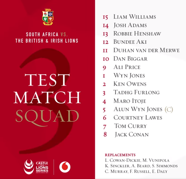 ბრიტანელი და ირლანდიელი ლომების მთავარმა მწვრთნელმა უორენ გეთლენდმა სამხრეთ აფრიკის ნაკრებთან გასამართი გადამწყვეტი, მესამე მატჩისთვის შემადგენლობა დაასახელა.